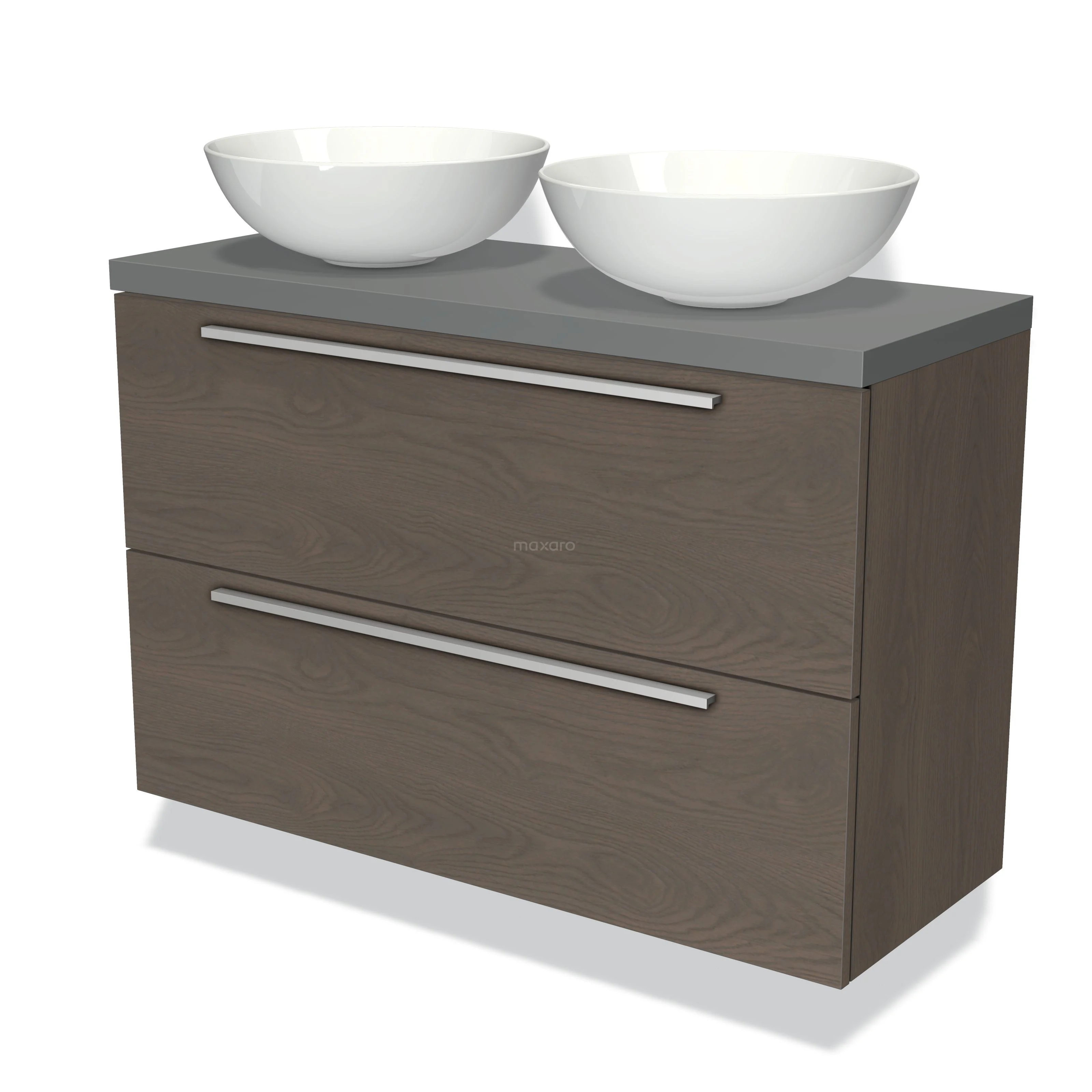 Modulo Plato Slim Badmöbel mit Aufsatzwaschbecken | 100 cm Dunkelbraune Eiche Flach front Mittelgrau blatt 2 übereinanderliegende Schubladen