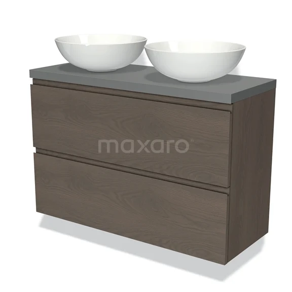 Modulo Plato Slim Badmöbel mit Aufsatzwaschbecken | 100 cm Dunkelbraune Eiche Grifflos front Mittelgrau blatt 2 übereinanderliegende Schubladen