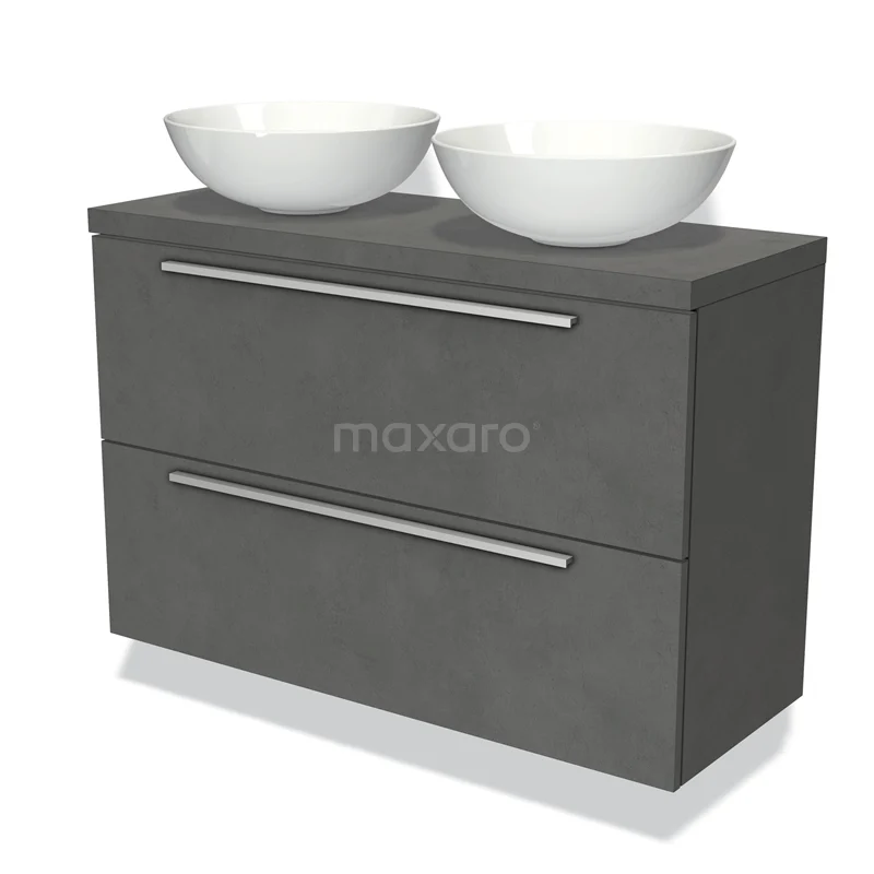 Modulo Plato Slim Badmöbel mit Aufsatzwaschbecken | 100 cm Dunkelgrauer Beton Flach front Dunkelgrauer Beton blatt 2 übereinanderliegende Schubladen