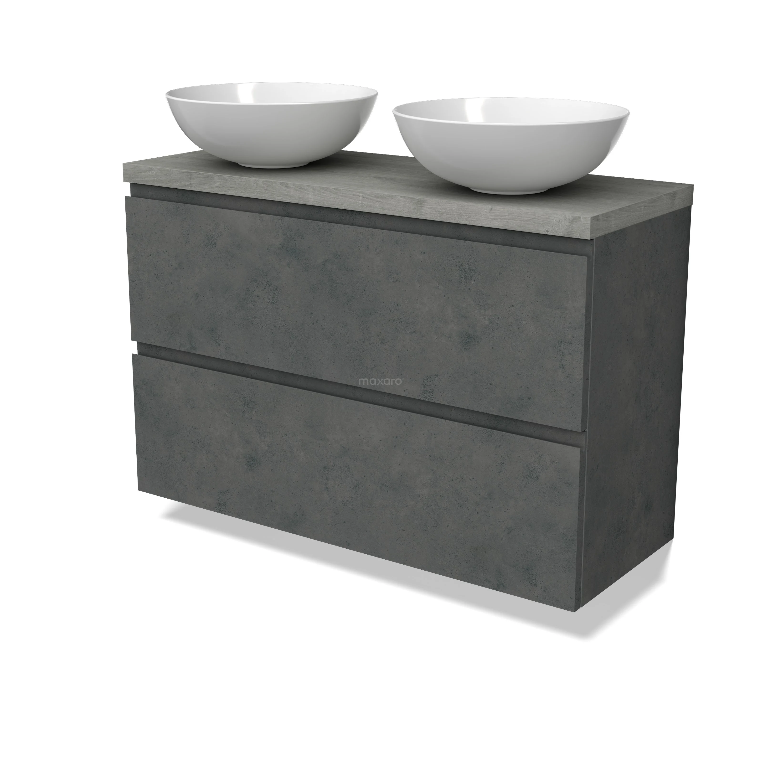 Modulo Plato Slim Badmöbel mit Aufsatzwaschbecken | 100 cm Dunkelgrauer Beton Grifflos front Graue Eiche blatt 2 übereinanderliegende Schubladen