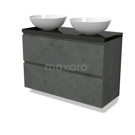 Modulo Plato Slim Badmöbel mit Aufsatzwaschbecken | 100 cm Dunkelgrauer Beton Grifflos front Hochglanz Schwarz blatt 2 übereinanderliegende Schubladen