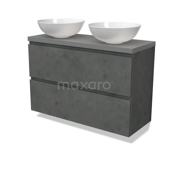 Modulo Plato Slim Badmöbel mit Aufsatzwaschbecken | 100 cm Dunkelgrauer Beton Grifflos front Mittelgrau blatt 2 übereinanderliegende Schubladen