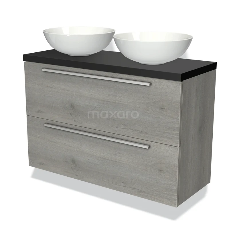 Modulo Plato Slim Badmöbel mit Aufsatzwaschbecken | 100 cm Graue Eiche Flach front Matt Schwarz blatt 2 übereinanderliegende Schubladen
