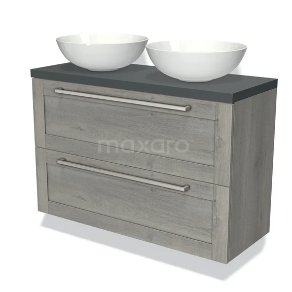 Modulo Plato Slim Badmöbel mit Aufsatzwaschbecken | 100 cm Graue Eiche Rahmen front Dunkelgrau blatt 2 übereinanderliegende Schubladen