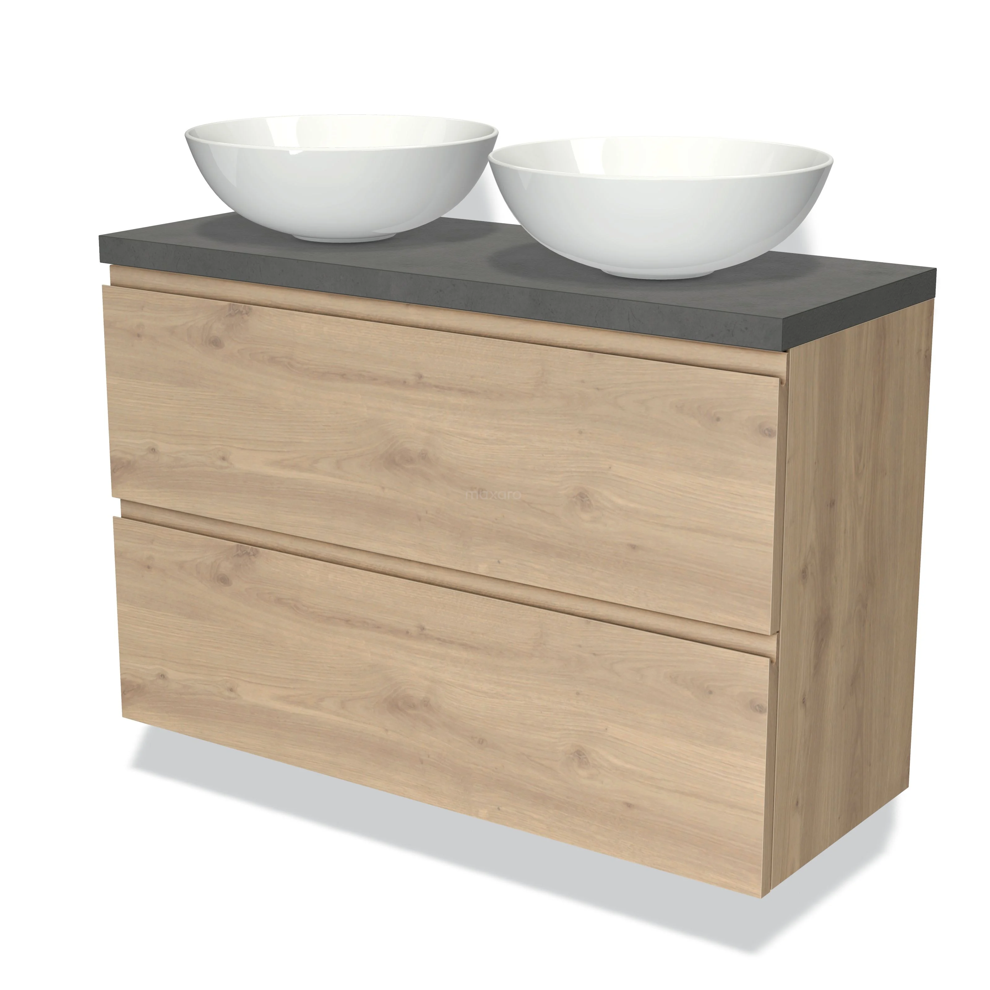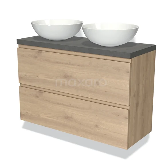 Modulo Plato Slim Badmöbel mit Aufsatzwaschbecken | 100 cm Hellbraune Eiche Grifflos front Dunkelgrauer Beton blatt 2 übereinanderliegende Schubladen