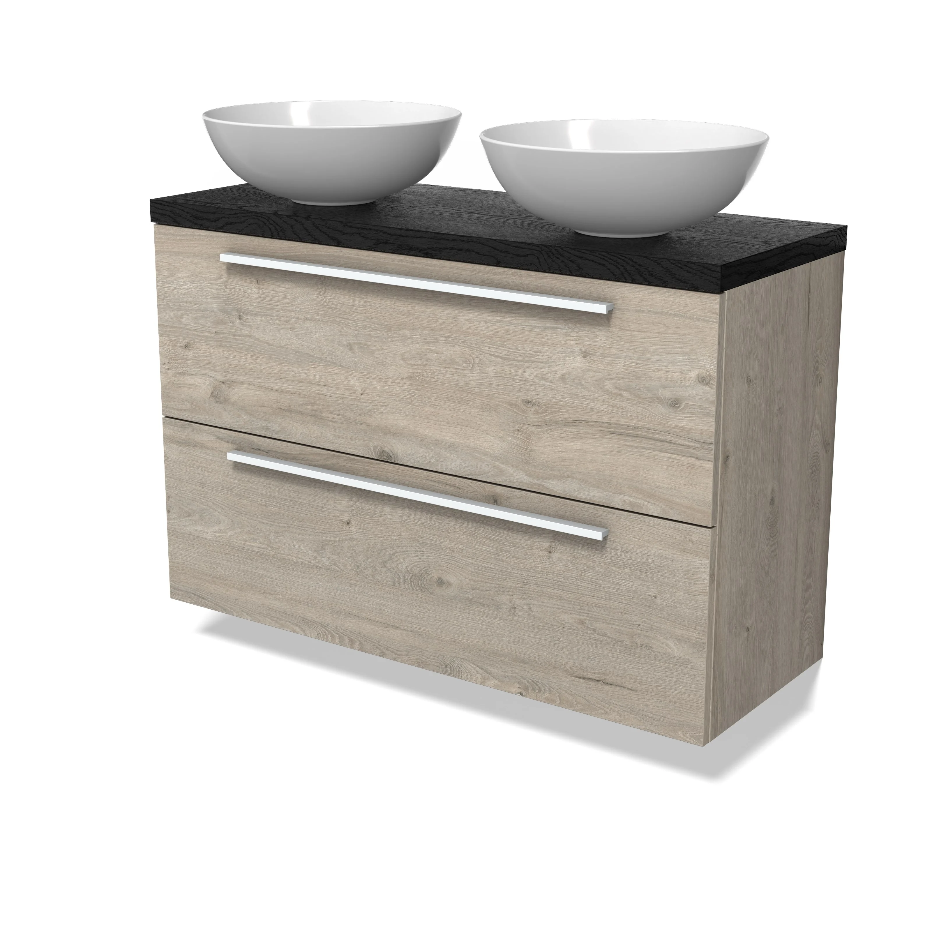 Modulo Plato Slim Badmöbel mit Aufsatzwaschbecken | 100 cm Hellgraue Eiche Flach front Schwarze Eiche blatt 2 übereinanderliegende Schubladen