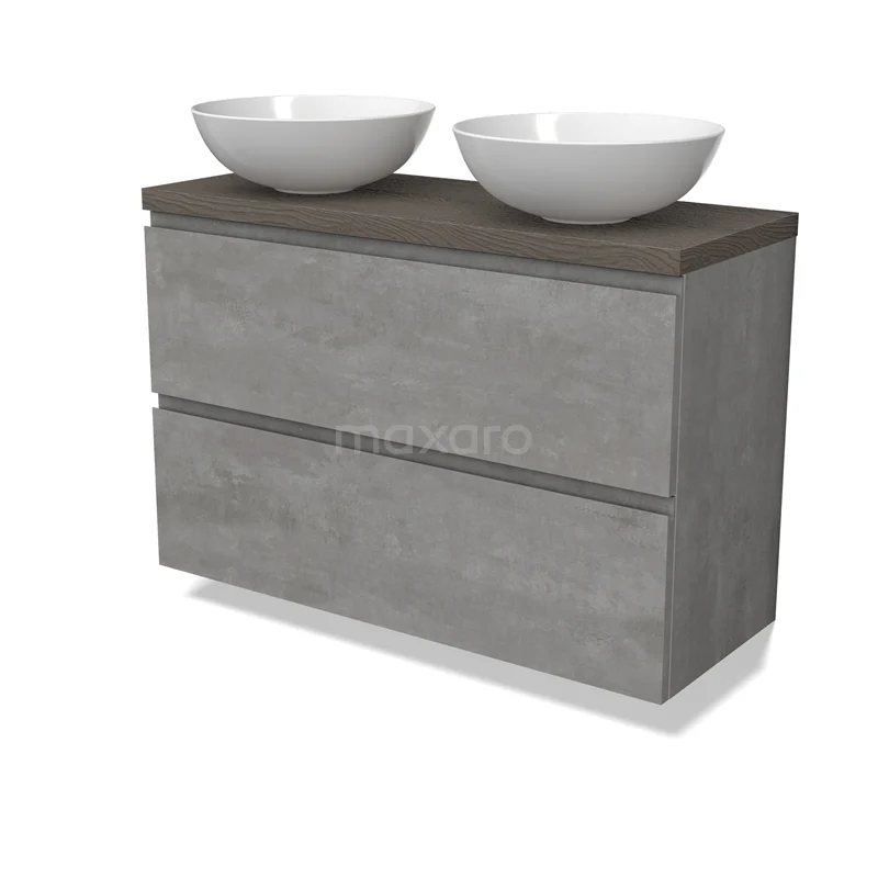 Modulo Plato Slim Badmöbel mit Aufsatzwaschbecken | 100 cm Hellgrauer Beton Grifflos front Dunkelbraune Eiche blatt 2 übereinanderliegende Schubladen
