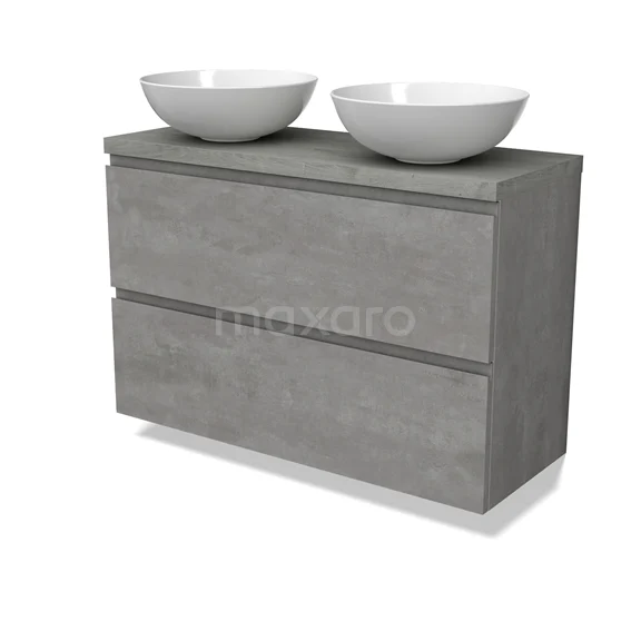Modulo Plato Slim Badmöbel mit Aufsatzwaschbecken | 100 cm Hellgrauer Beton Grifflos front Graue Eiche blatt 2 übereinanderliegende Schubladen