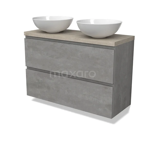 Modulo Plato Slim Badmöbel mit Aufsatzwaschbecken | 100 cm Hellgrauer Beton Grifflos front Hellgraue Eiche blatt 2 übereinanderliegende Schubladen