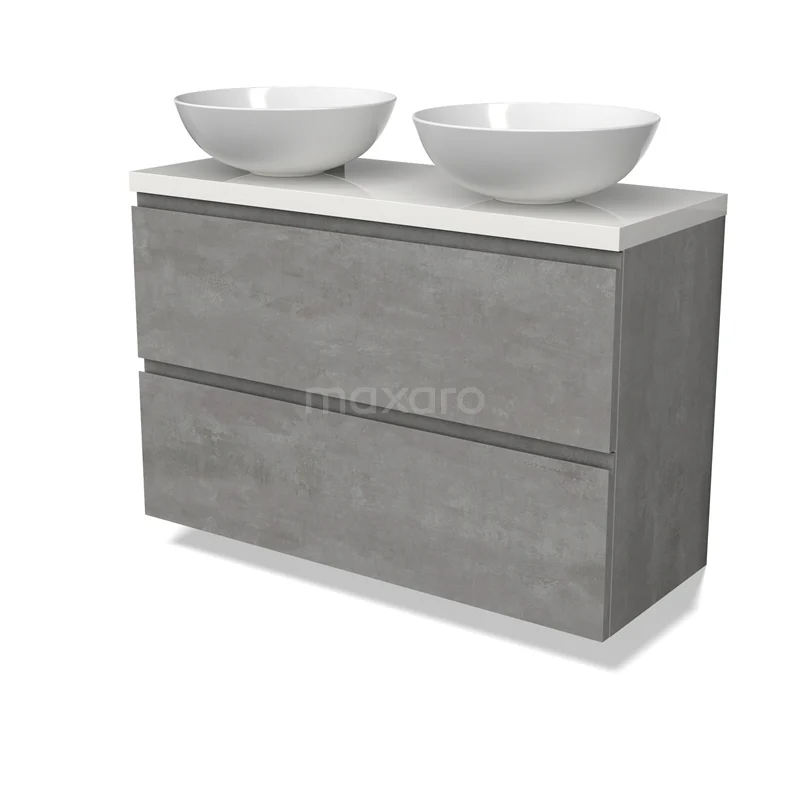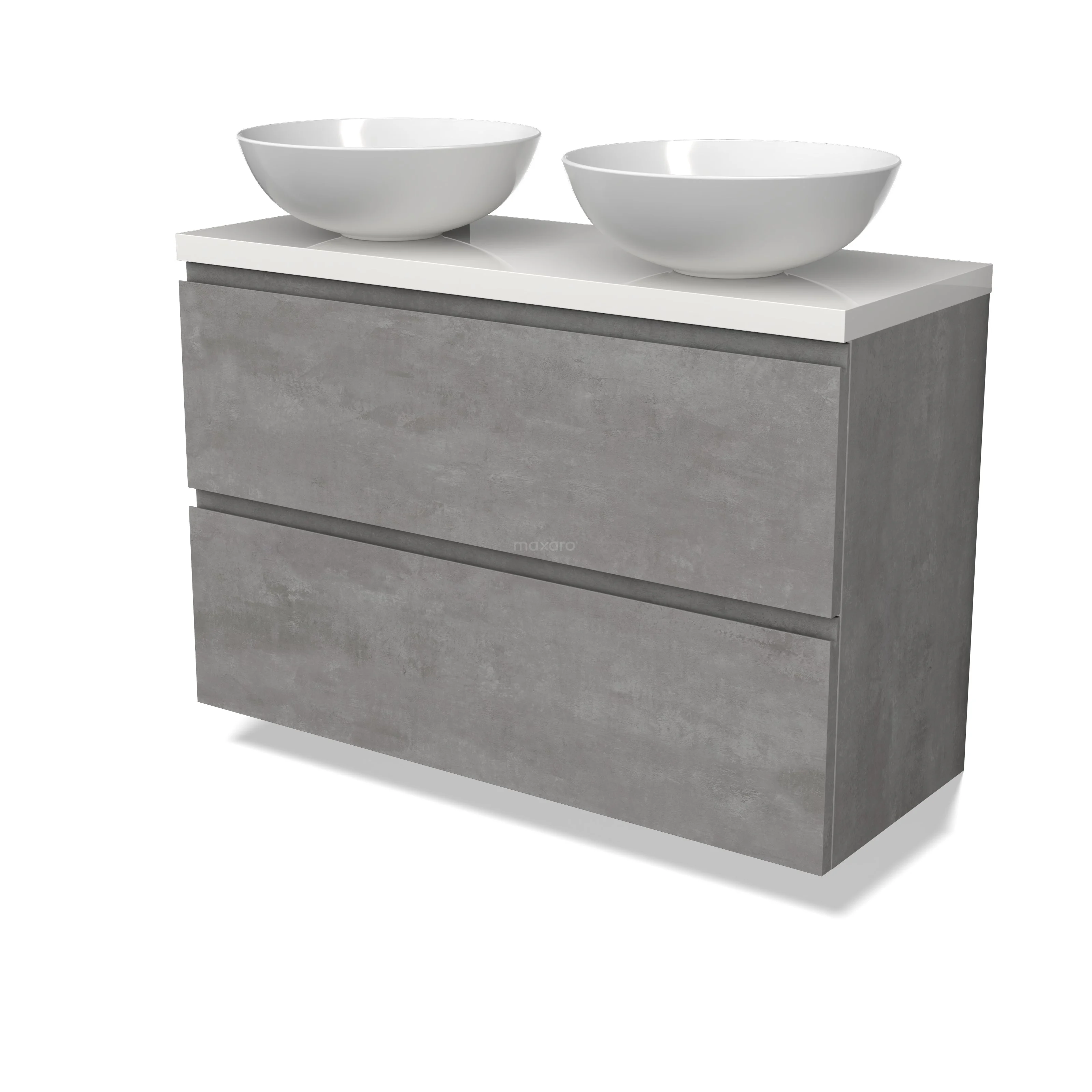 Modulo Plato Slim Badmöbel mit Aufsatzwaschbecken | 100 cm Hellgrauer Beton Grifflos front Hochglanz Weiß blatt 2 übereinanderliegende Schubladen