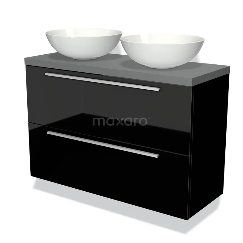 Modulo Plato Slim Badmöbel mit Aufsatzwaschbecken | 100 cm Hochglanz Schwarz Flach front Mittelgrau blatt 2 übereinanderliegende Schubladen