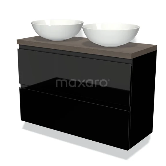 Modulo Plato Slim Badmöbel mit Aufsatzwaschbecken | 100 cm Hochglanz Schwarz Grifflos front Dunkelbraune Eiche blatt 2 übereinanderliegende Schubladen