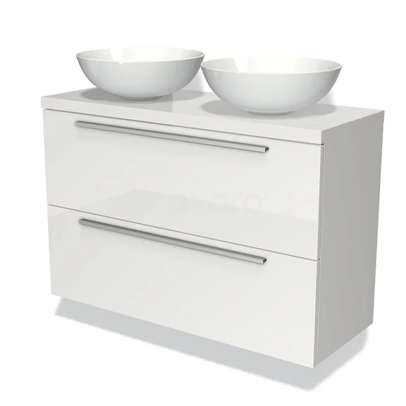 Modulo Plato Slim Badmöbel mit Aufsatzwaschbecken | 100 cm Hochglanz Weiß Flach front Hochglanz Weiß blatt 2 übereinanderliegende Schubladen