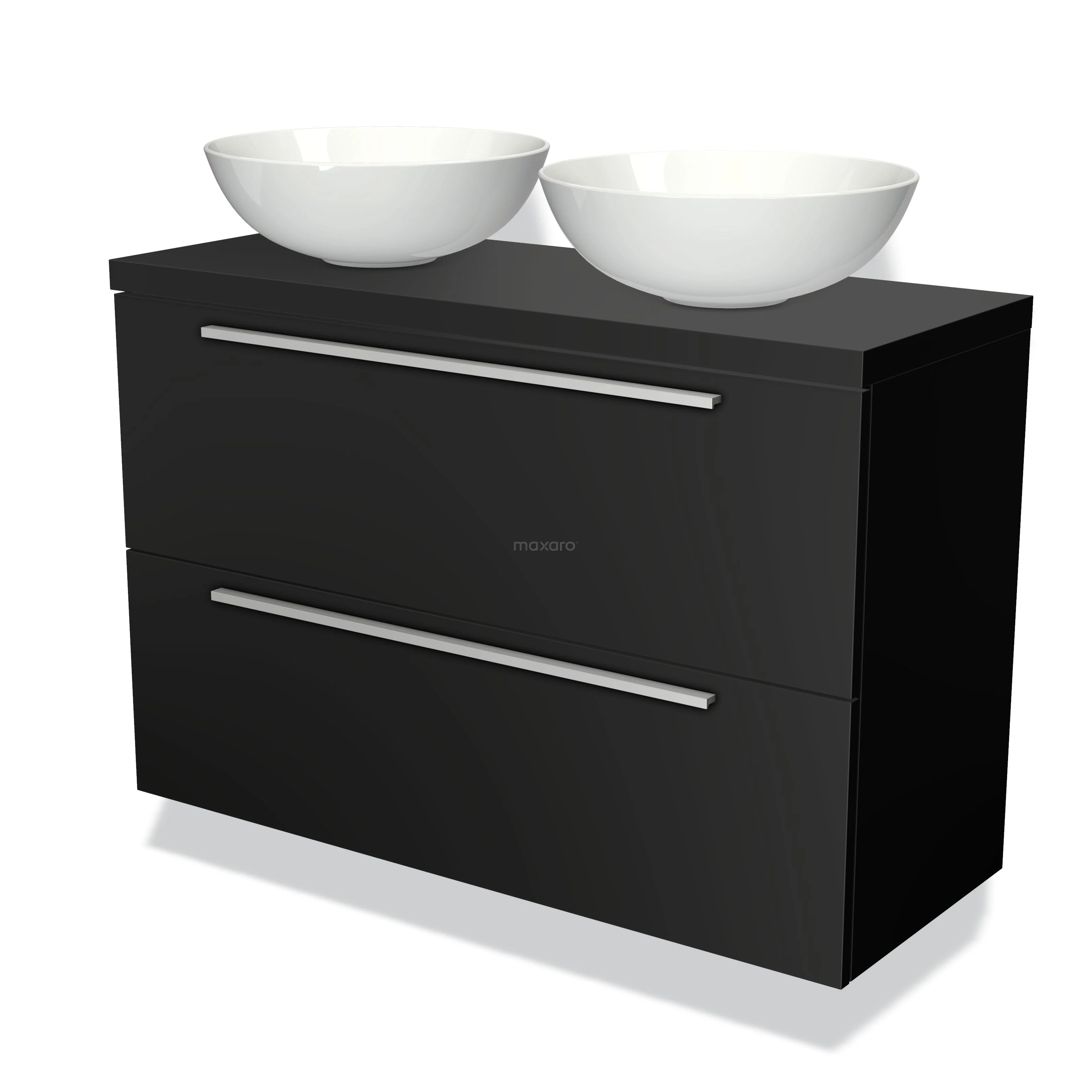 Modulo Plato Slim Badmöbel mit Aufsatzwaschbecken | 100 cm Matt Schwarz Flach front Matt Schwarz blatt 2 übereinanderliegende Schubladen
