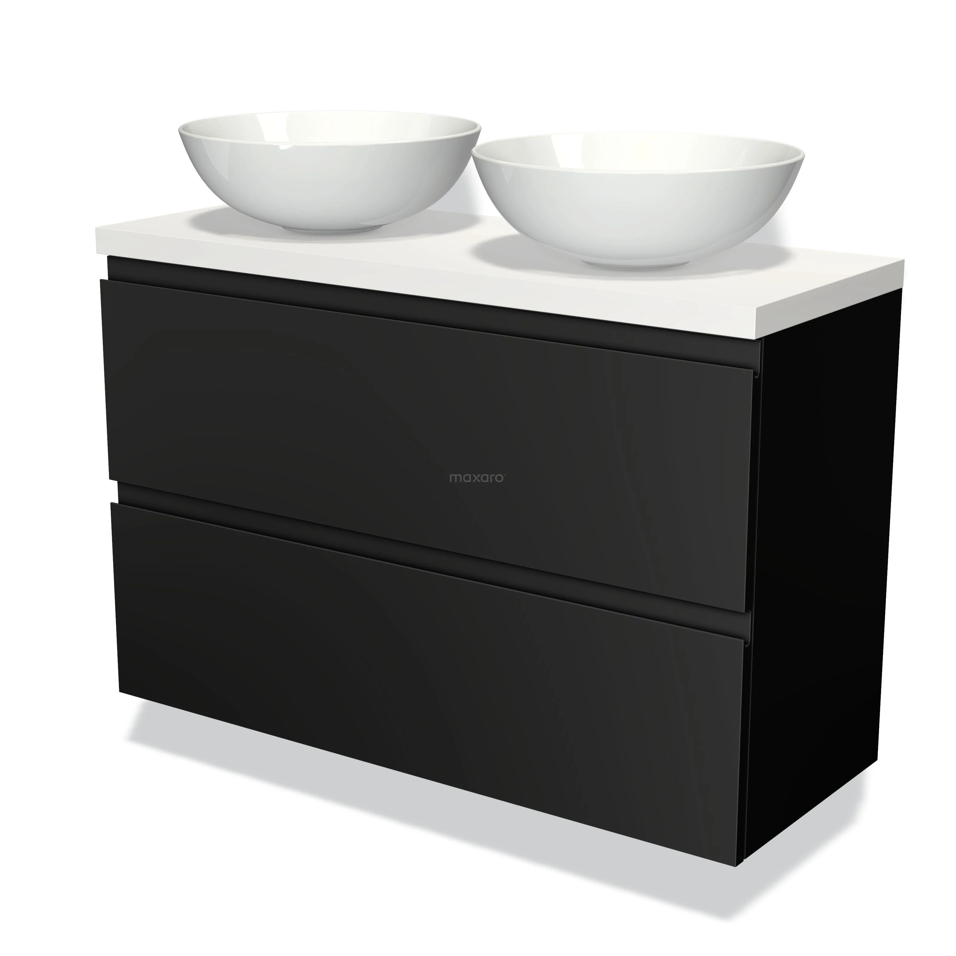 Modulo Plato Slim Badmöbel mit Aufsatzwaschbecken | 100 cm Matt Schwarz Grifflos front Matt Weiß blatt 2 übereinanderliegende Schubladen
