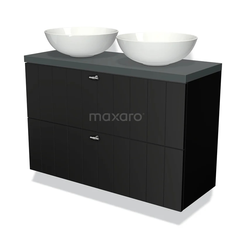 Modulo Plato Slim Badmöbel mit Aufsatzwaschbecken | 100 cm Matt Schwarz Lamelle front Dunkelgrau blatt 2 übereinanderliegende Schubladen
