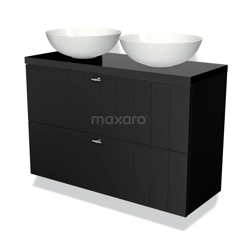 Modulo Plato Slim Badmöbel mit Aufsatzwaschbecken | 100 cm Matt Schwarz Lamelle front Hochglanz Schwarz blatt 2 übereinanderliegende Schubladen