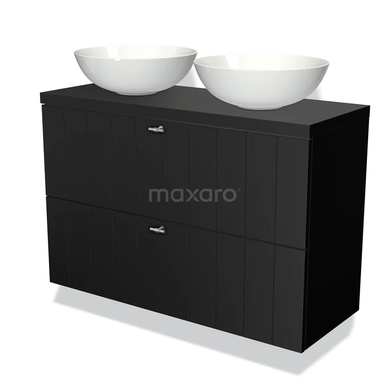 Modulo Plato Slim Badmöbel mit Aufsatzwaschbecken | 100 cm Matt Schwarz Lamelle front Matt Schwarz blatt 2 übereinanderliegende Schubladen