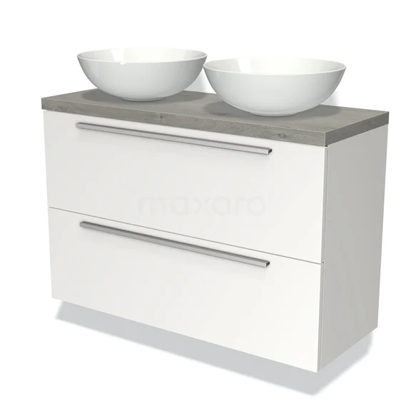 Modulo Plato Slim Badmöbel mit Aufsatzwaschbecken | 100 cm Matt Weiß Flach front Graue Eiche blatt 2 übereinanderliegende Schubladen