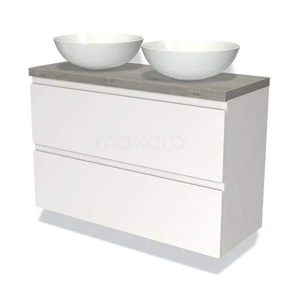 Modulo Plato Slim Badmöbel mit Aufsatzwaschbecken | 100 cm Matt Weiß Grifflos front Graue Eiche blatt 2 übereinanderliegende Schubladen
