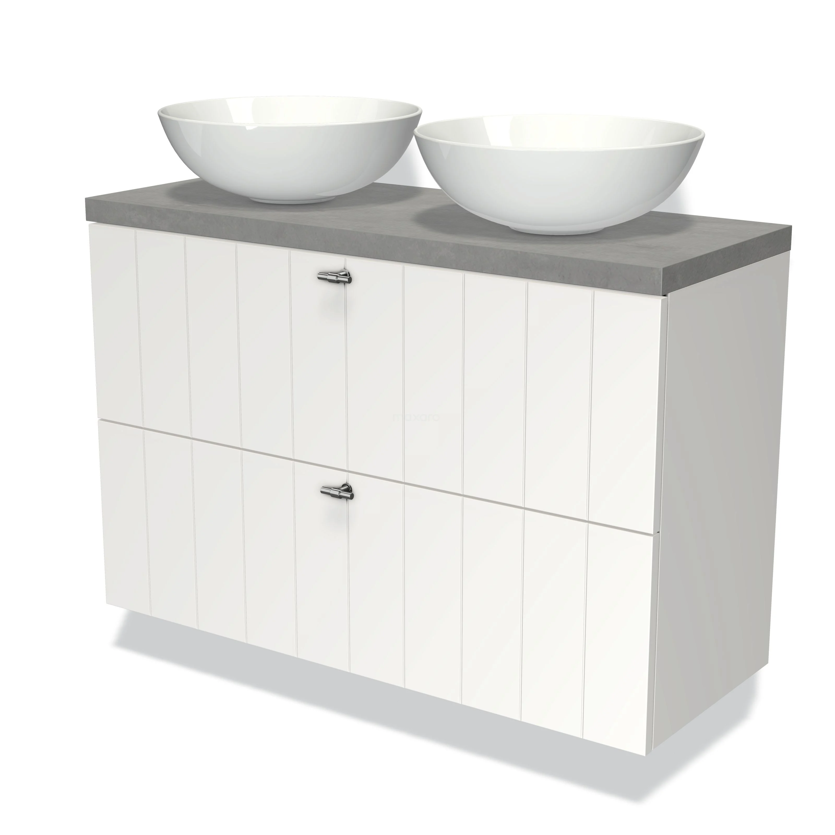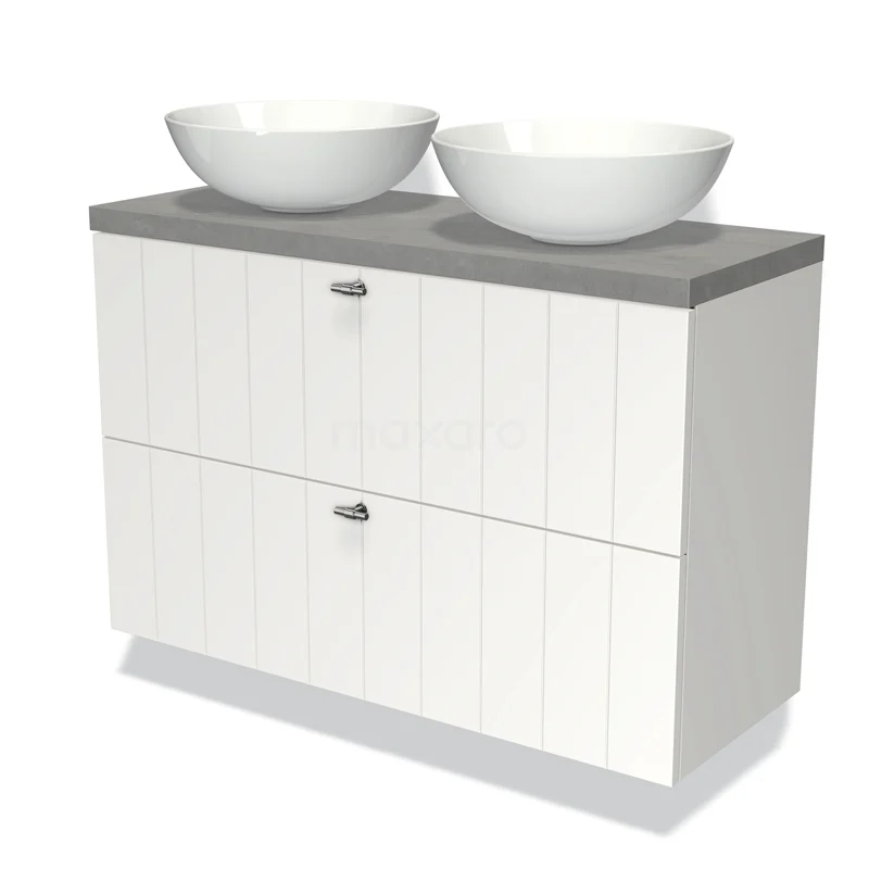 Modulo Plato Slim Badmöbel mit Aufsatzwaschbecken | 100 cm Matt Weiß Lamelle front Hellgrauer Beton blatt 2 übereinanderliegende Schubladen