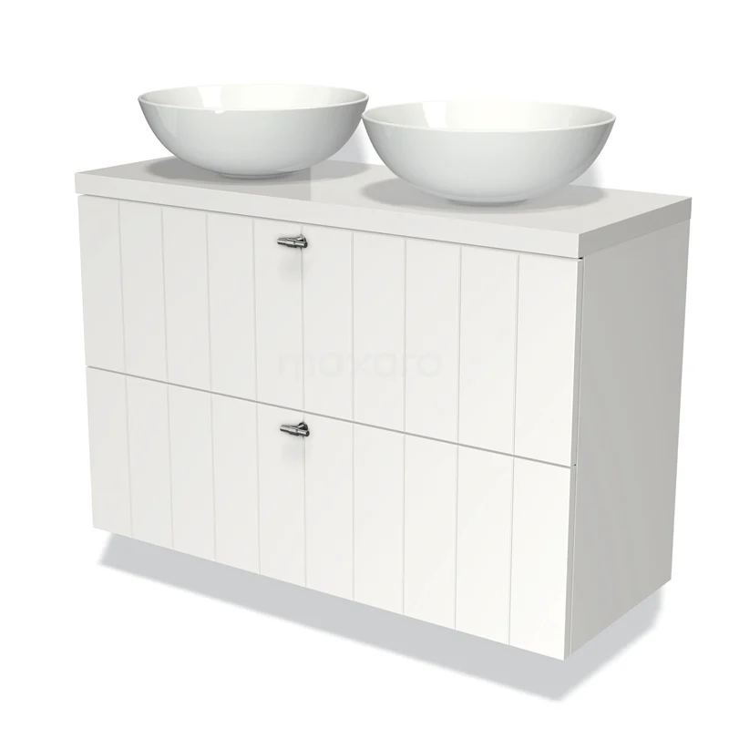 Modulo Plato Slim Badmöbel mit Aufsatzwaschbecken | 100 cm Matt Weiß Lamelle front Hochglanz Weiß blatt 2 übereinanderliegende Schubladen