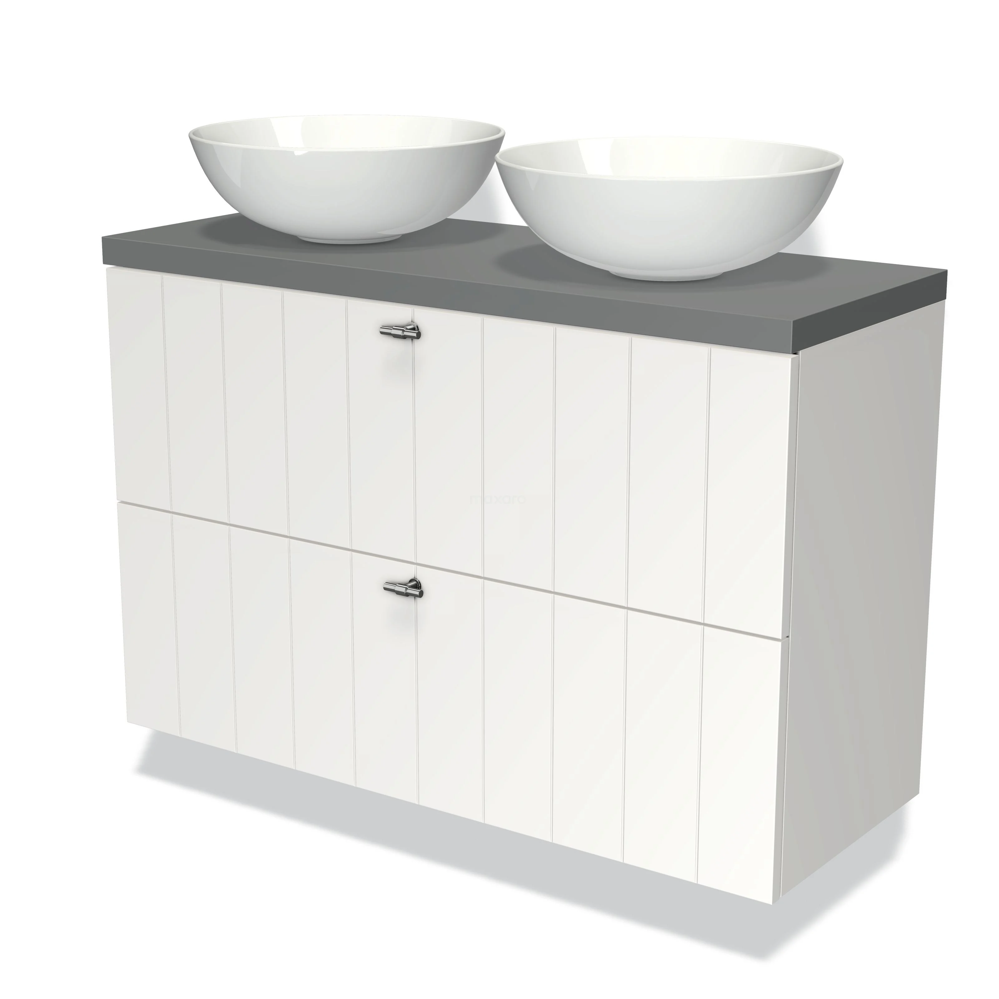 Modulo Plato Slim Badmöbel mit Aufsatzwaschbecken | 100 cm Matt Weiß Lamelle front Mittelgrau blatt 2 übereinanderliegende Schubladen