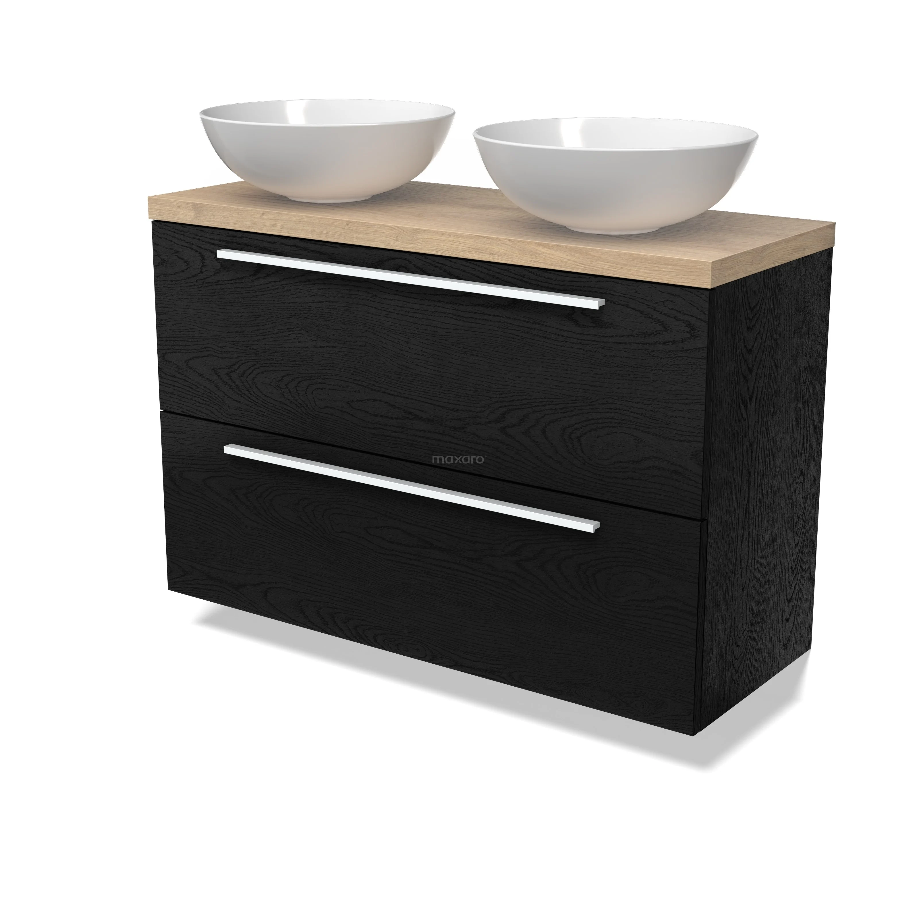 Modulo Plato Slim Badmöbel mit Aufsatzwaschbecken | 100 cm Schwarze Eiche Flach front Hellbraune Eiche blatt 2 übereinanderliegende Schubladen