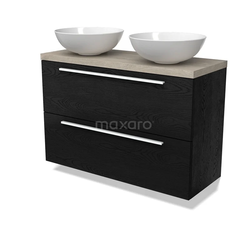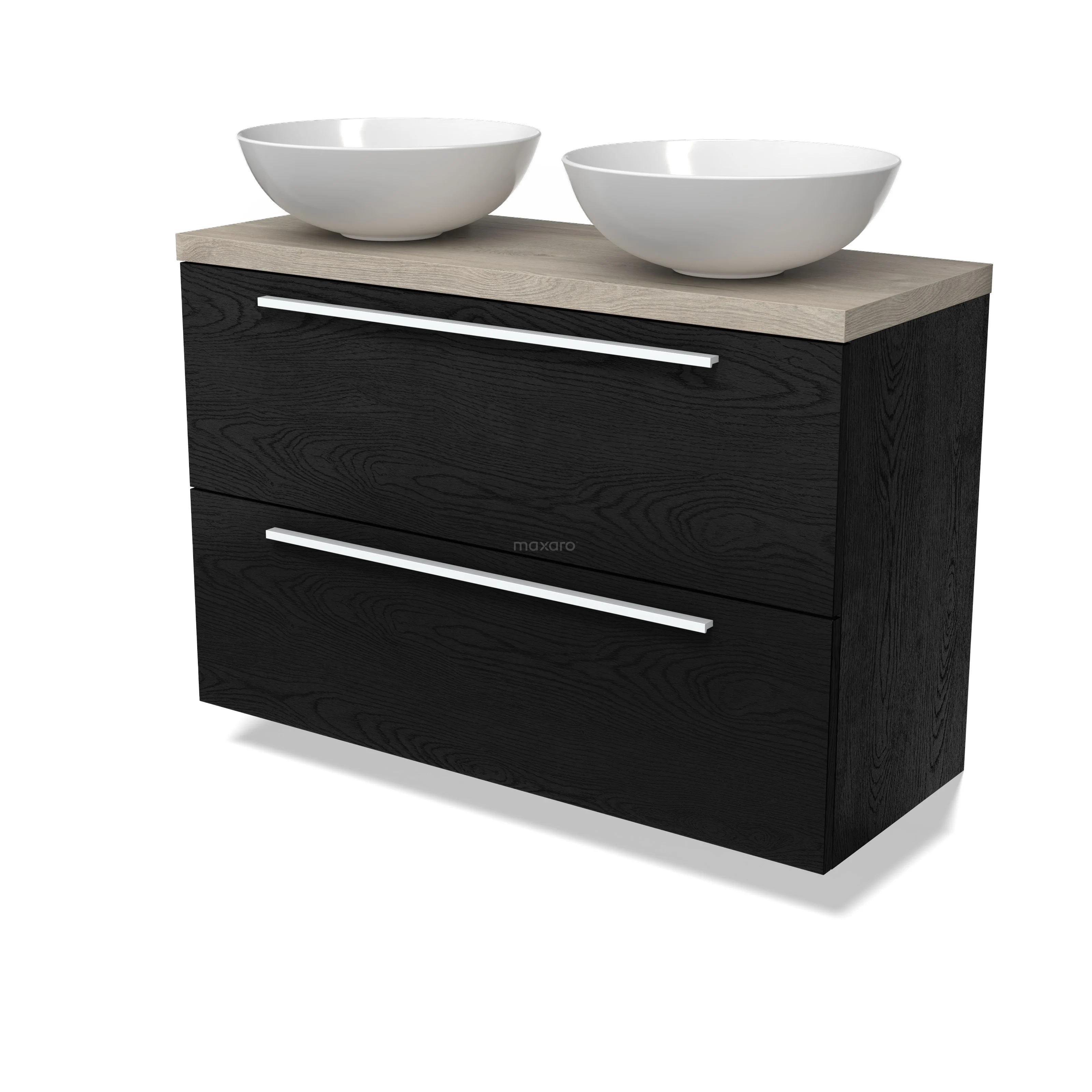 Modulo Plato Slim Badmöbel mit Aufsatzwaschbecken | 100 cm Schwarze Eiche Flach front Hellgraue Eiche blatt 2 übereinanderliegende Schubladen