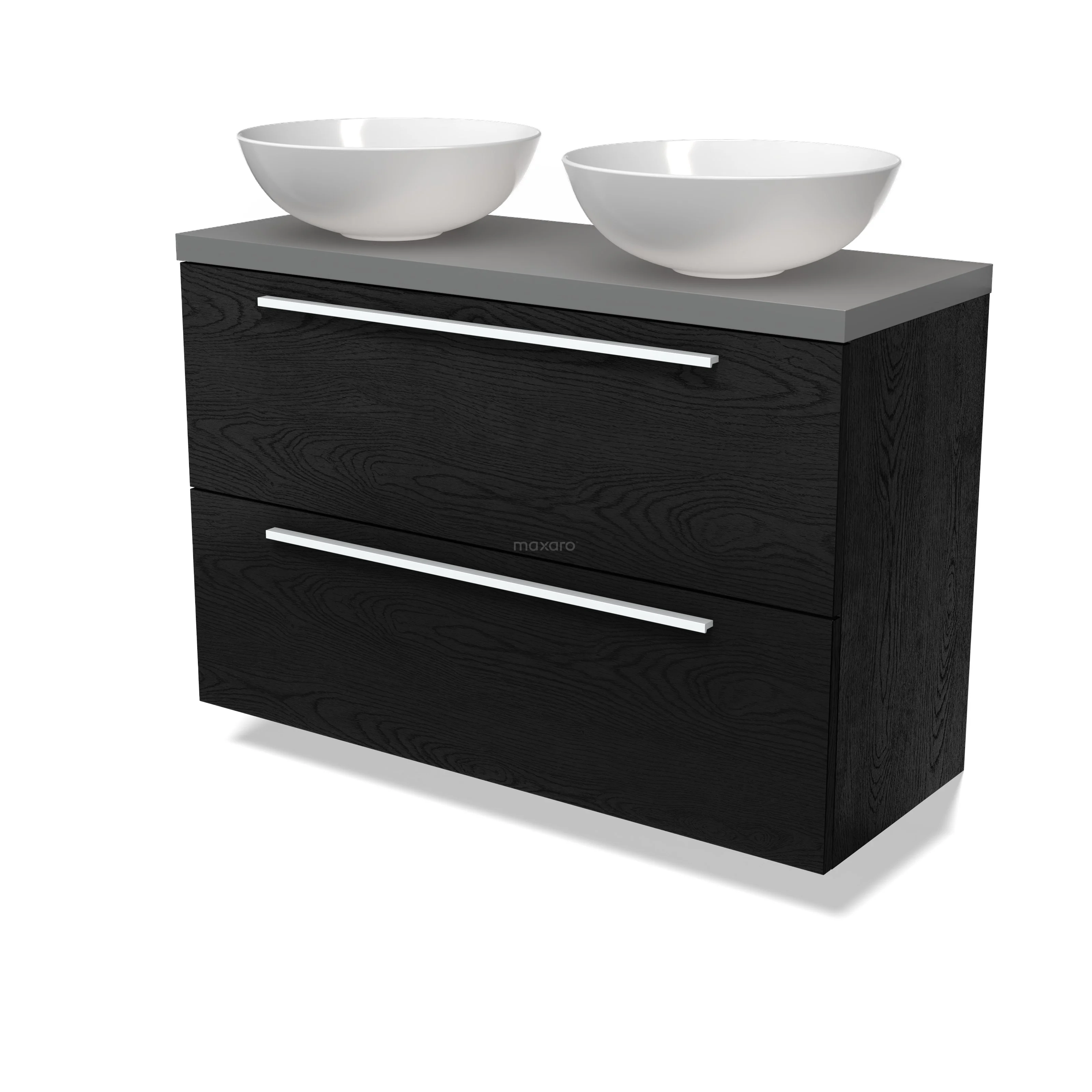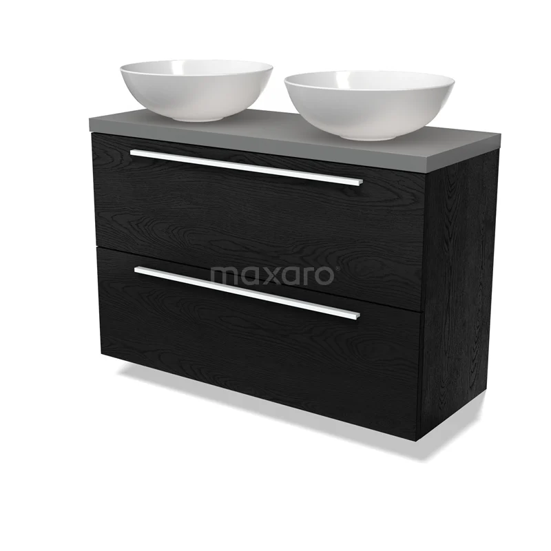 Modulo Plato Slim Badmöbel mit Aufsatzwaschbecken | 100 cm Schwarze Eiche Flach front Mittelgrau blatt 2 übereinanderliegende Schubladen