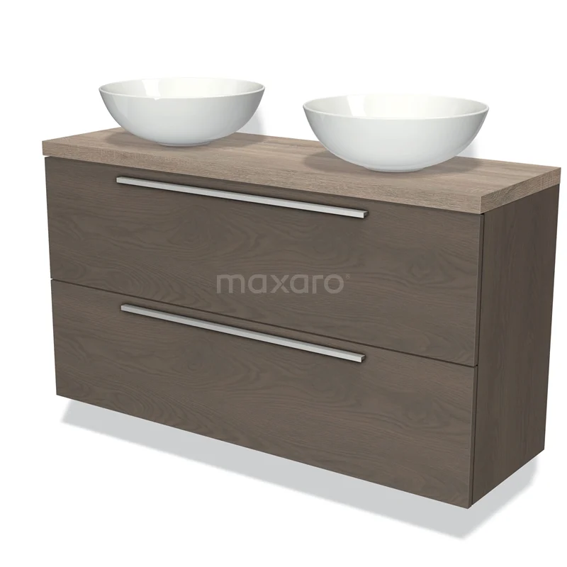 Modulo Plato Slim Badmöbel mit Aufsatzwaschbecken | 120 cm Dunkelbraune Eiche Flach front Eiche blatt 2 übereinanderliegende Schubladen