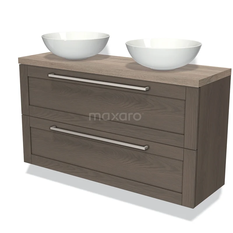 Modulo Plato Slim Badmöbel mit Aufsatzwaschbecken | 120 cm Dunkelbraune Eiche Rahmen front Eiche blatt 2 übereinanderliegende Schubladen