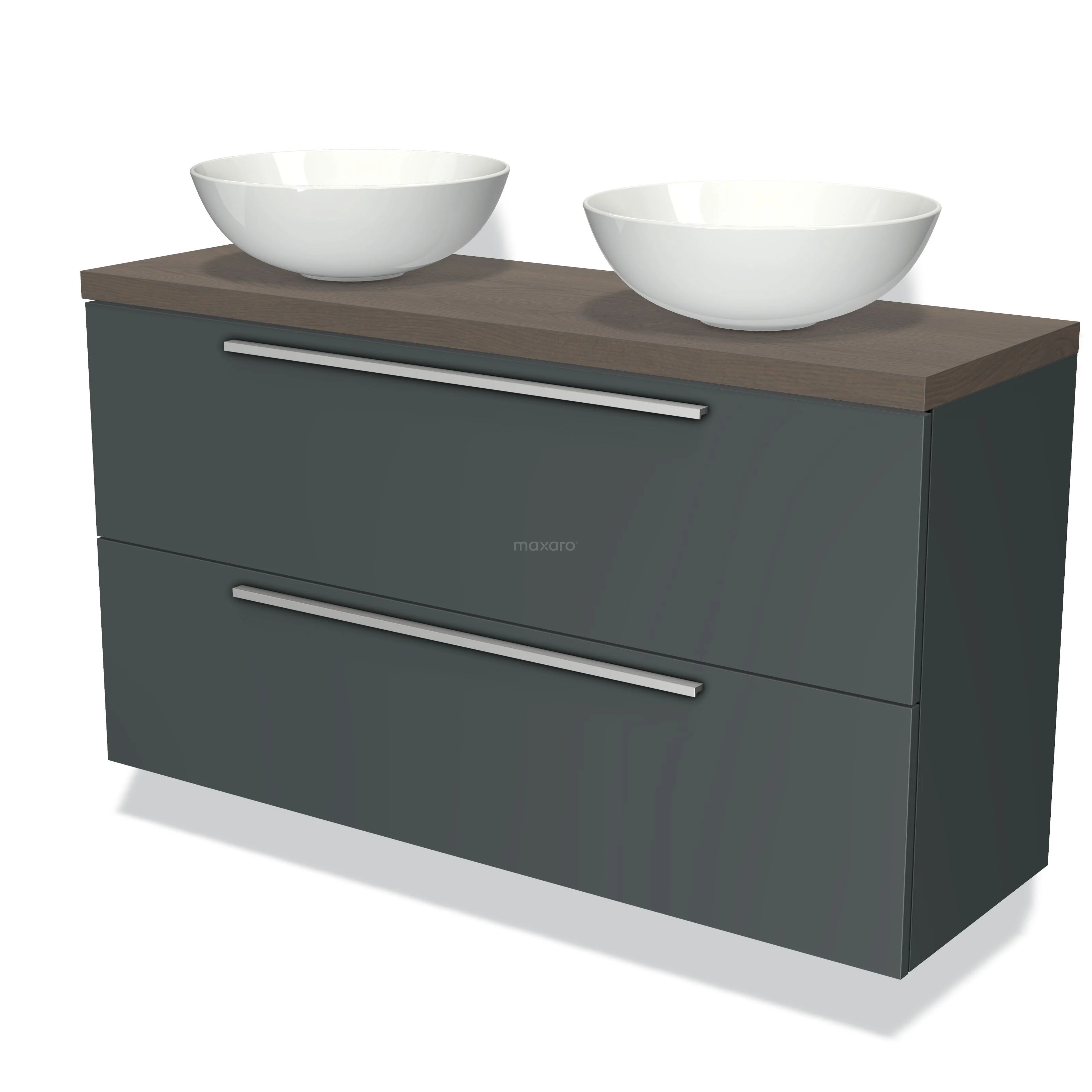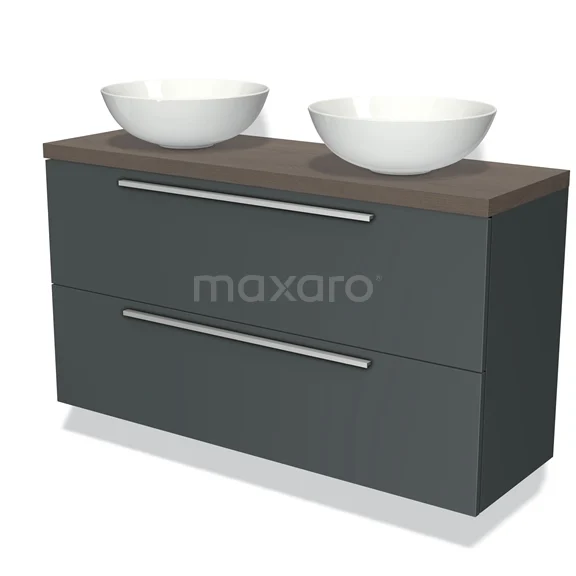 Modulo Plato Slim Badmöbel mit Aufsatzwaschbecken | 120 cm Dunkelgrau Flach front Dunkelbraune Eiche blatt 2 übereinanderliegende Schubladen