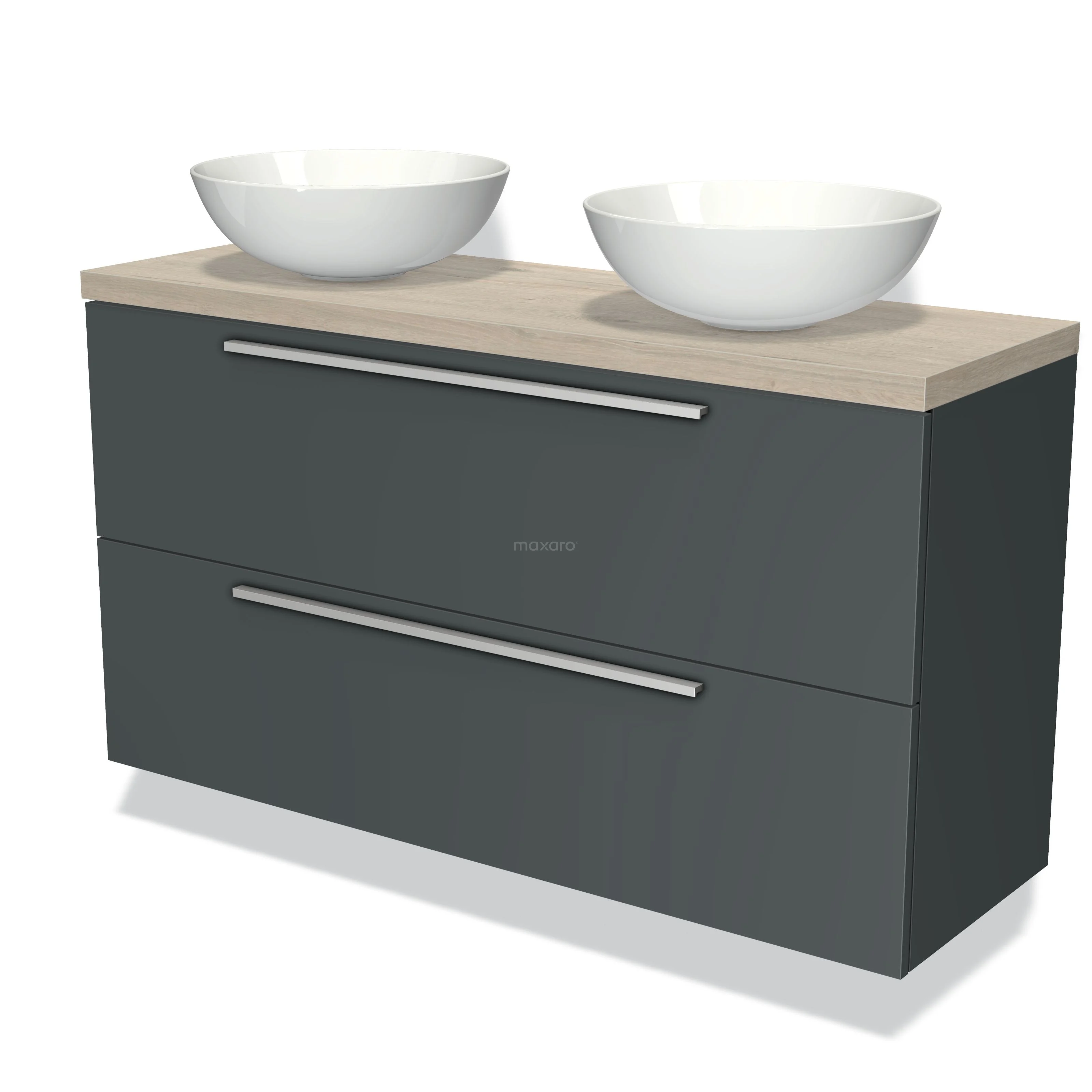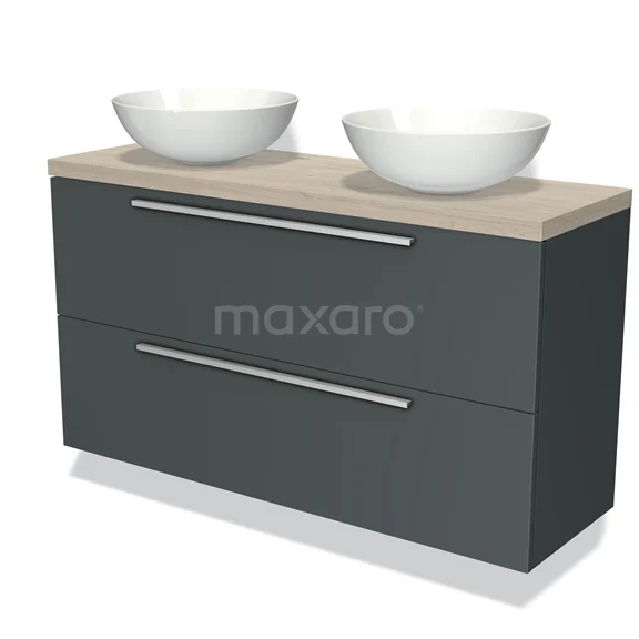 Modulo Plato Slim Badmöbel mit Aufsatzwaschbecken | 120 cm Dunkelgrau Flach front Hellgraue Eiche blatt 2 übereinanderliegende Schubladen