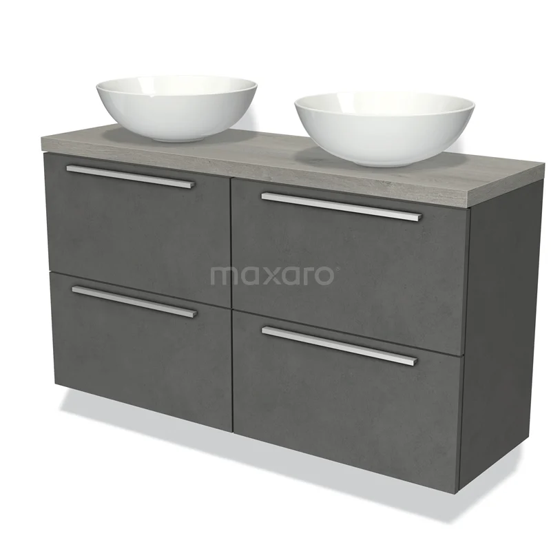 Modulo Plato Slim Badmöbel mit Aufsatzwaschbecken | 120 cm Dunkelgrauer Beton Flach front Graue Eiche blatt 4 Schubladen