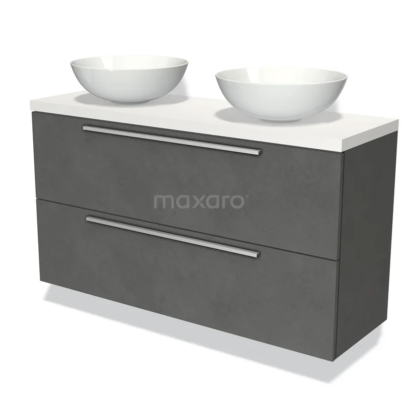Modulo Plato Slim Badmöbel mit Aufsatzwaschbecken | 120 cm Dunkelgrauer Beton Flach front Matt Weiß blatt 2 übereinanderliegende Schubladen