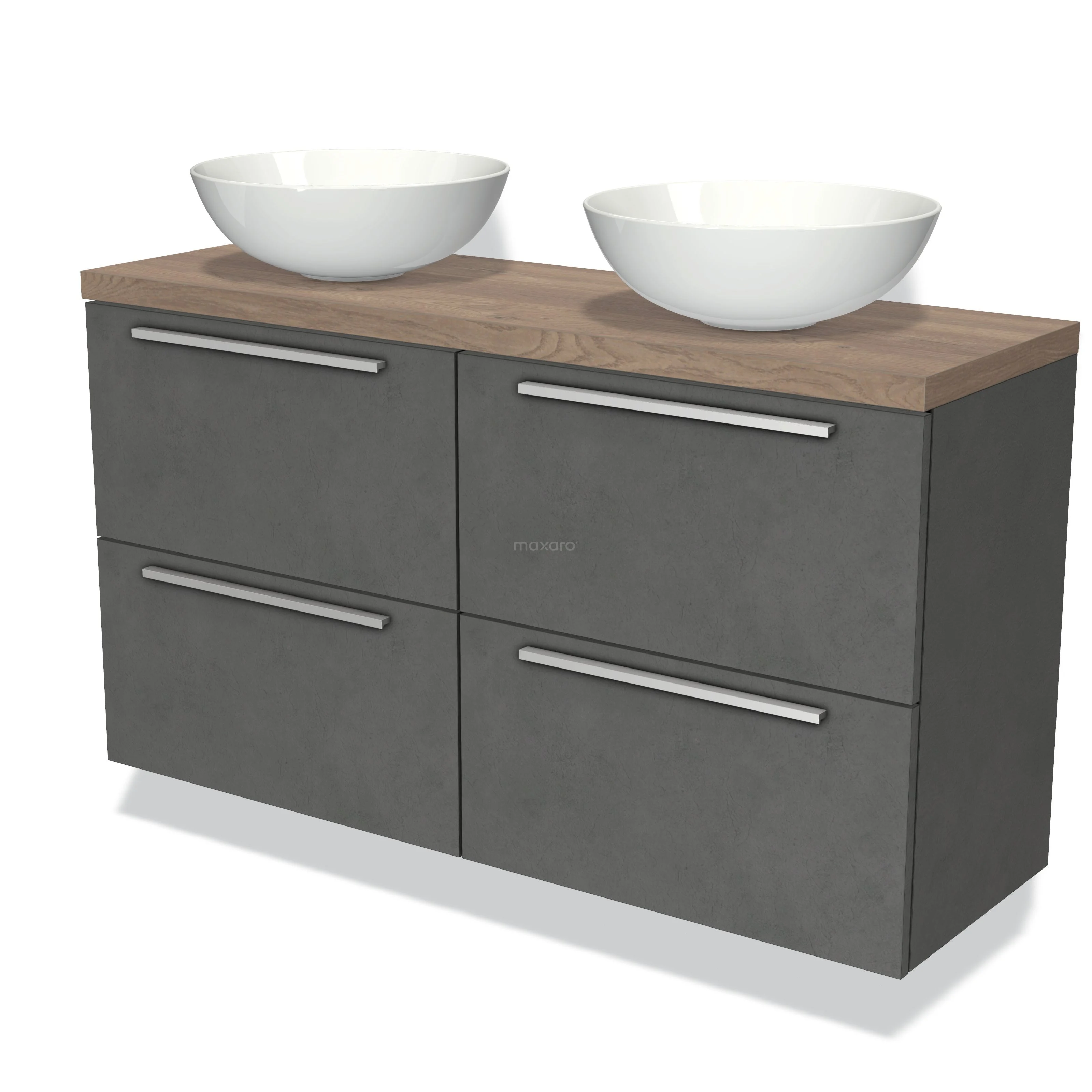 Modulo Plato Slim Badmöbel mit Aufsatzwaschbecken | 120 cm Dunkelgrauer Beton Flach front Mittelbraune Eiche blatt 4 Schubladen