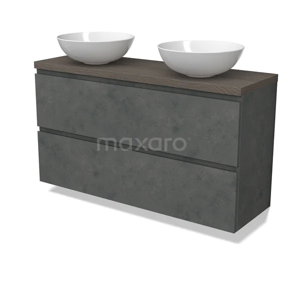 Modulo Plato Slim Badmöbel mit Aufsatzwaschbecken | 120 cm Dunkelgrauer Beton Grifflos front Dunkelbraune Eiche blatt 2 übereinanderliegende Schubladen