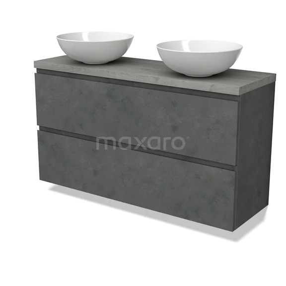 Modulo Plato Slim Badmöbel mit Aufsatzwaschbecken | 120 cm Dunkelgrauer Beton Grifflos front Graue Eiche blatt 2 übereinanderliegende Schubladen