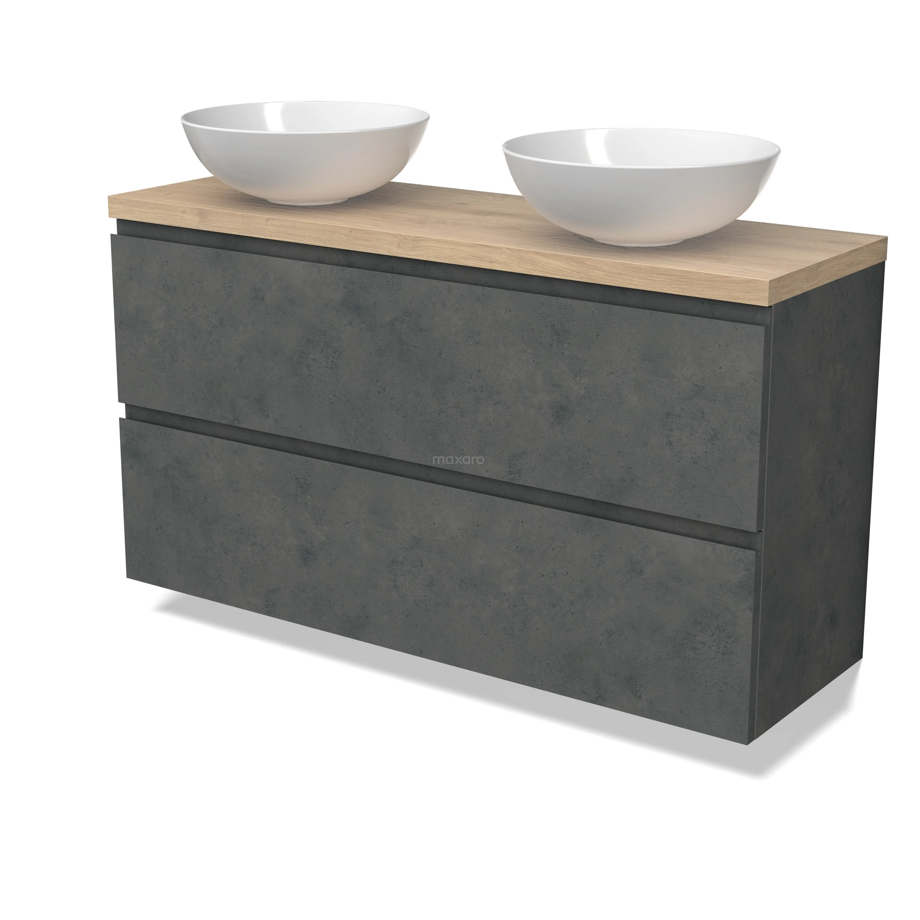 Modulo Plato Slim Badmöbel mit Aufsatzwaschbecken | 120 cm Dunkelgrauer Beton Grifflos front Hellbraune Eiche blatt 2 übereinanderliegende Schubladen