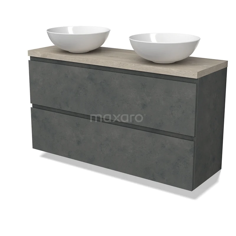 Modulo Plato Slim Badmöbel mit Aufsatzwaschbecken | 120 cm Dunkelgrauer Beton Grifflos front Hellgraue Eiche blatt 2 übereinanderliegende Schubladen