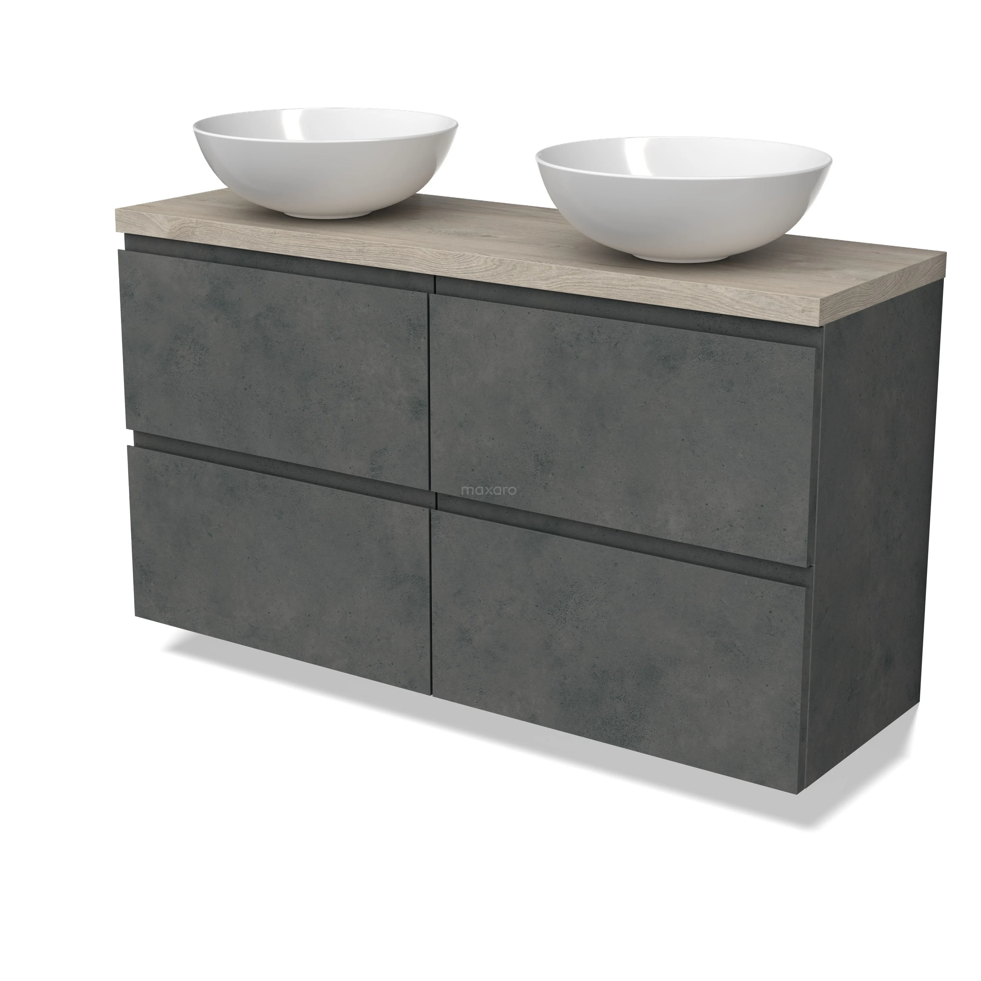 Modulo Plato Slim Badmöbel mit Aufsatzwaschbecken | 120 cm Dunkelgrauer Beton Grifflos front Hellgraue Eiche blatt 4 Schubladen