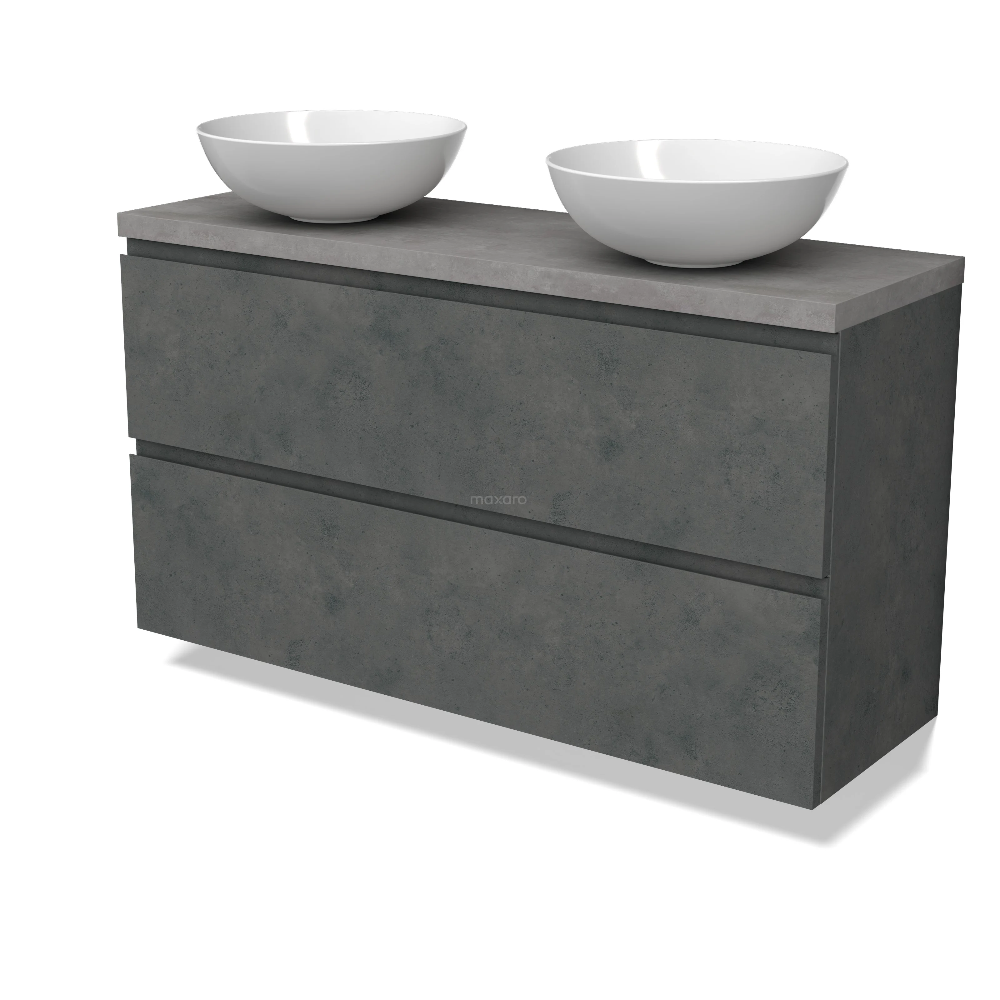 Modulo Plato Slim Badmöbel mit Aufsatzwaschbecken | 120 cm Dunkelgrauer Beton Grifflos front Hellgrauer Beton blatt 2 übereinanderliegende Schubladen