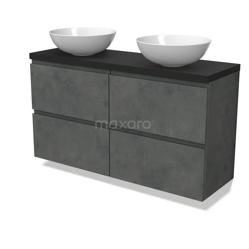 Modulo Plato Slim Badmöbel mit Aufsatzwaschbecken | 120 cm Dunkelgrauer Beton Grifflos front Matt Schwarz blatt 4 Schubladen