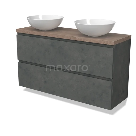 Modulo Plato Slim Badmöbel mit Aufsatzwaschbecken | 120 cm Dunkelgrauer Beton Grifflos front Mittelbraune Eiche blatt 2 übereinanderliegende Schubladen