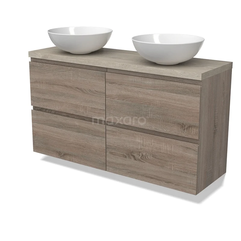 Modulo Plato Slim Badmöbel mit Aufsatzwaschbecken | 120 cm Eiche Grifflos front Hellgraue Eiche blatt 4 Schubladen