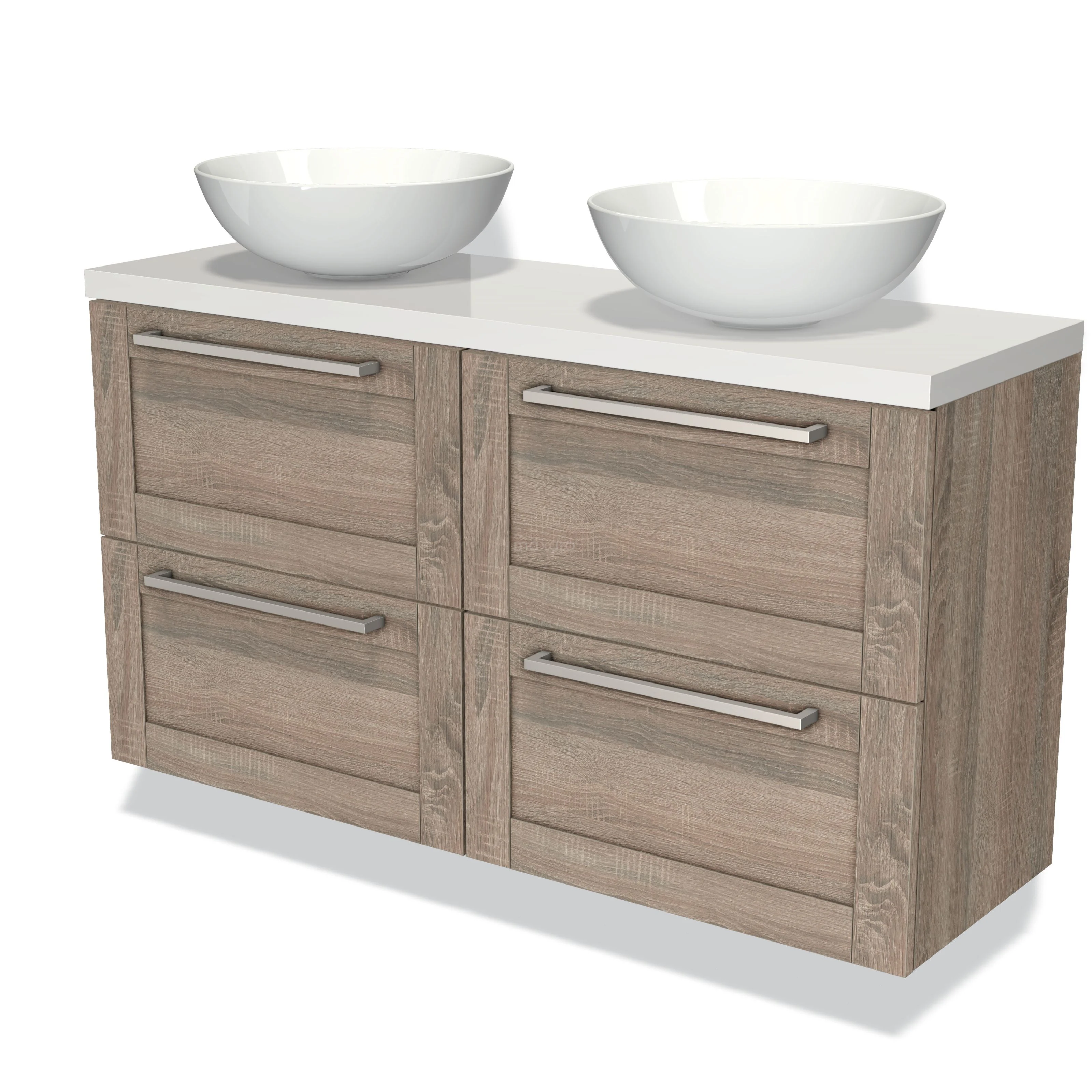 Modulo Plato Slim Badmöbel mit Aufsatzwaschbecken | 120 cm Eiche Rahmen front Hochglanz Weiß blatt 4 Schubladen