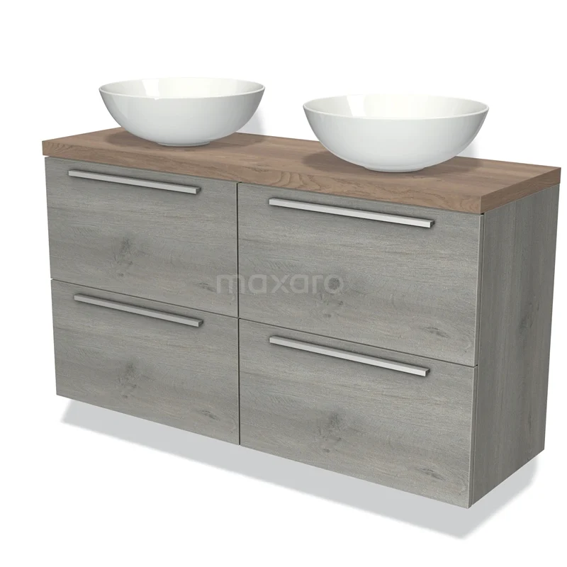 Modulo Plato Slim Badmöbel mit Aufsatzwaschbecken | 120 cm Graue Eiche Flach front Mittelbraune Eiche blatt 4 Schubladen