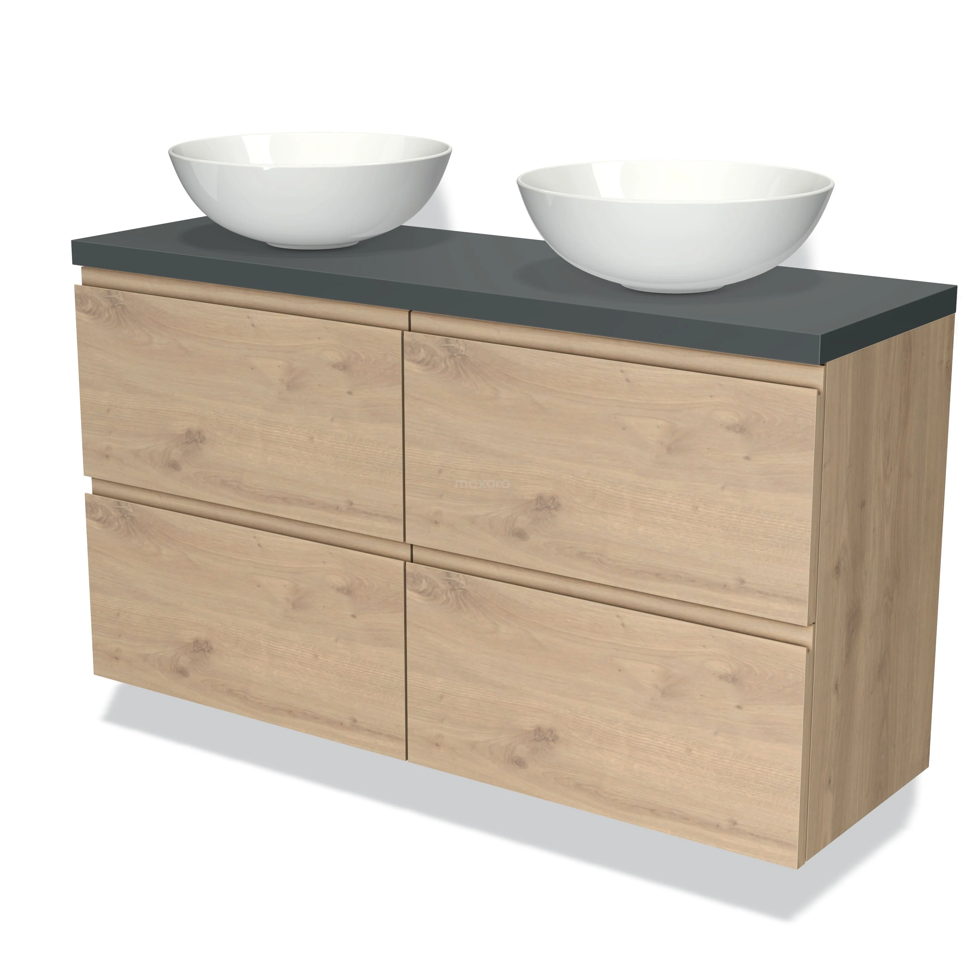 Modulo Plato Slim Badmöbel mit Aufsatzwaschbecken | 120 cm Hellbraune Eiche Grifflos front Dunkelgrau blatt 4 Schubladen
