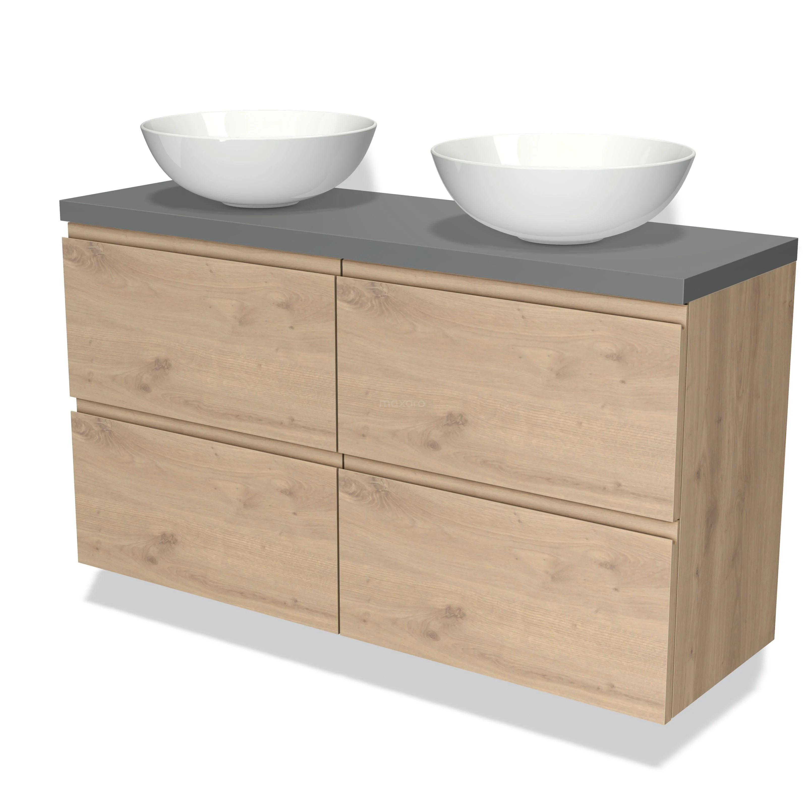 Modulo Plato Slim Badmöbel mit Aufsatzwaschbecken | 120 cm Hellbraune Eiche Grifflos front Mittelgrau blatt 4 Schubladen